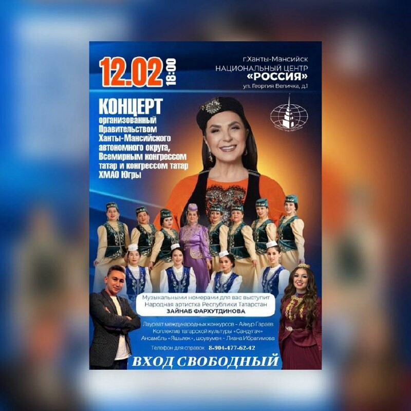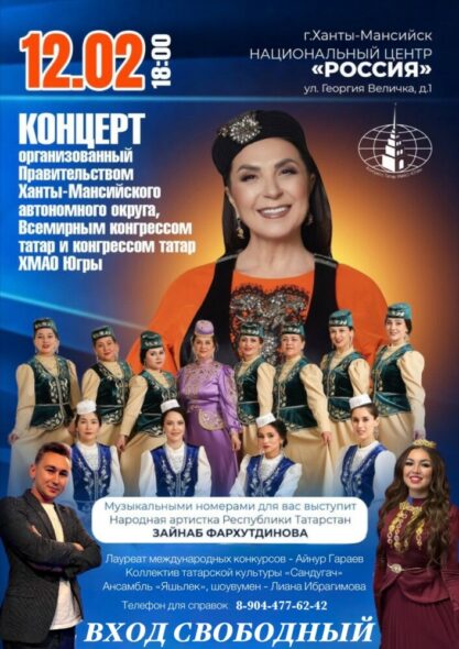 В Ханты-Мансийске состоится выездное заседание с участием представителей Всемирного конгресса татар. В честь этого события будет организован благотворительный концерт с участием народных артистов, лауреатов международных конкурсов, виртуозов и местных творческих коллективов.