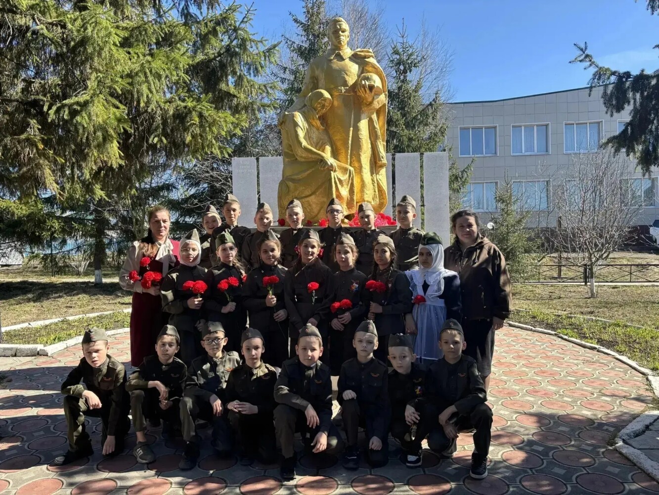 Музыкаль чыгыштан соң укучылар тирән хөрмәт белән һәйкәлгә чәчәкләр салдылар. Бу хәрәкәт баш өстендә тыныч күк йөзе өчен үз гомерләрен биргән кешеләргә рәхмәт символы булды.