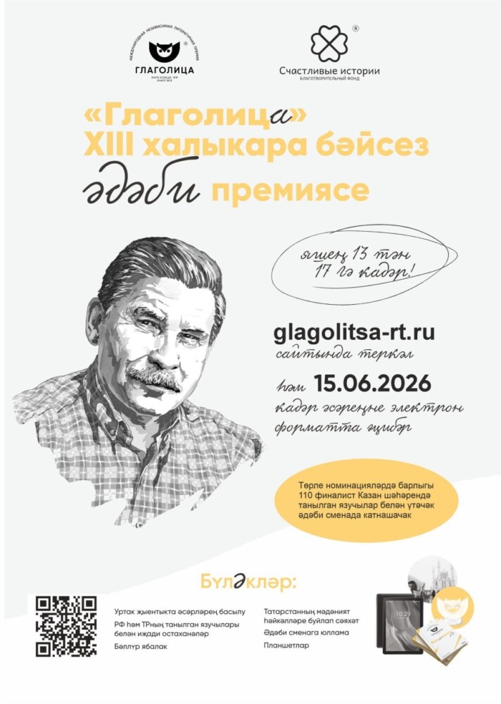 «Счастливые истории» хәйрия фонды «Глаголица» XIII халыкара бәйсез әдәби премиясен башлап җибәрде. 13–17 яшьлек егет-кызларны бәйгебездә татар телендә проза һәм поэзия номинацияләрендә катнашырга чакырабыз.