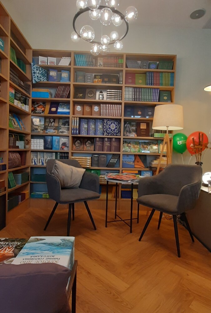*Сатып алучылар өчен йомшак кәнәфиләр куелган махсус почмак булдырылган. Биредә ошаган китапны ашыкмыйча карап чыгарга, укып утырырга һәм ял итәргә мөмкин.